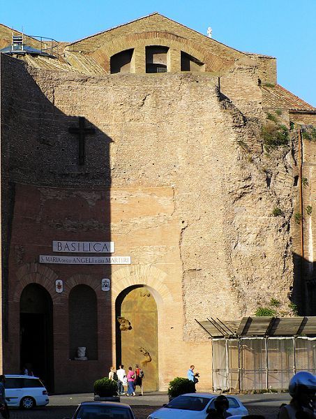 安傑利聖母教堂是利用戴克里先皇帝(284~305年在位)的時代興建,可同時容納3000人的大浴場遺跡改建而成的教堂。擔任設計的是邁入晚年的米開朗基羅,他利用遺跡城牆為立面。