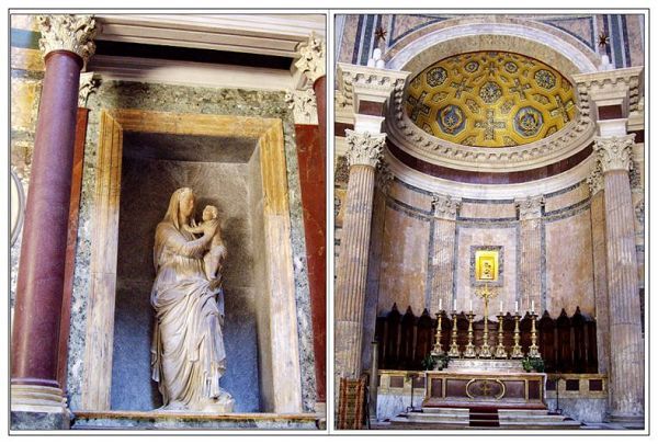 16根巨大圓柱並列在玄關後方的內部,被收納在直經約43.3公尺的球體內。由於拱門分散了整體的重量,所以站在萬神殿裡面,看不到柱子的蹤影。由圓頂採光窗射入室內的光線構造,也擔當以日光正確計時的功能。西元608年,這座羅馬神殿也成為獻給聖母與殉教者的教堂。藝術家拉斐爾還有維托‧艾曼紐2世也都在此長眠。