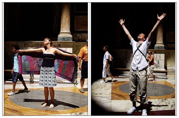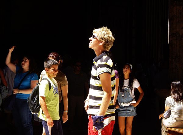 屋頂上著名的圓洞透進了一束明亮的光芒。很多觀光客在Oculus下方接受陽光的洗禮