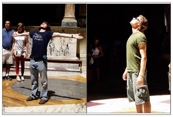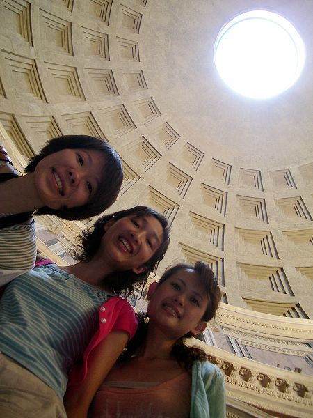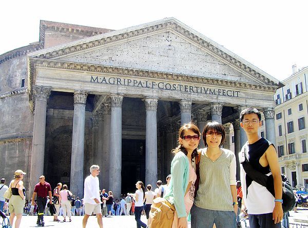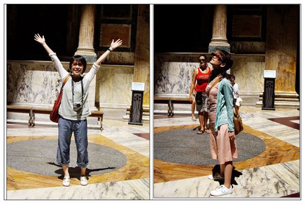 站在萬神殿的大圓頂下,我們一次次的嘗試,想要拍出令人滿意的照片,卻只能震懾於它的雄偉宏大;站在殿外的大圓柱旁,看著廣場前熙來攘往的人潮和羅馬著名的金杯咖啡店,靜靜的感受身後萬神殿的古老與周圍建築巧妙的融合~