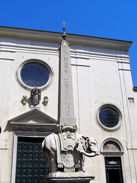在萬神殿的後方不遠處,就是密涅瓦之上的聖瑪麗亞教堂。教堂前方矗立著一座可愛的雕像。這隻可愛的大象和方尖碑的雕像,也是由貝尼尼所設計。這座老舊的方尖碑是在密涅瓦之上的聖瑪麗亞教堂的修道院庭園中發現的。