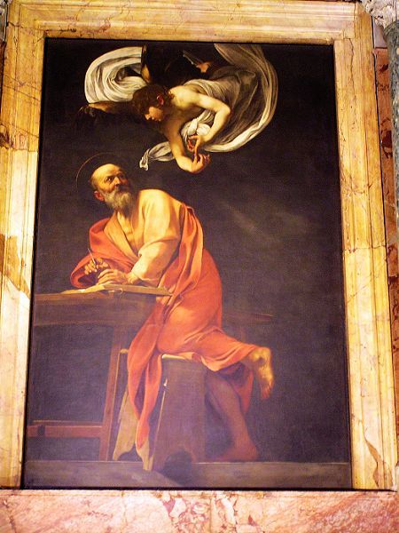 天使彷彿被包裹在精細摺紋的雲朵中,構成了一種漩渦型。正在書寫的聖者(馬太)十分驚訝,微微從桌子站起,一邊膝蓋支撐在小板凳上。整幅畫的構圖為大S形的螺旋,讓天使和聖者的動作互相結合。這幅畫採取低視點,所以有巨大的暗示性,而小凳子似乎朝向我們快要掉出畫布的表面。這幅畫在底色的暗色調上,搭配的是桌子和小凳子的棕色調,在光影中又可看出聖馬太朱紅的披風和天使白色的衣服。卡拉瓦喬利用暖色調也就是光的顏色,強調光的透明度,使這些色彩更加鮮明。