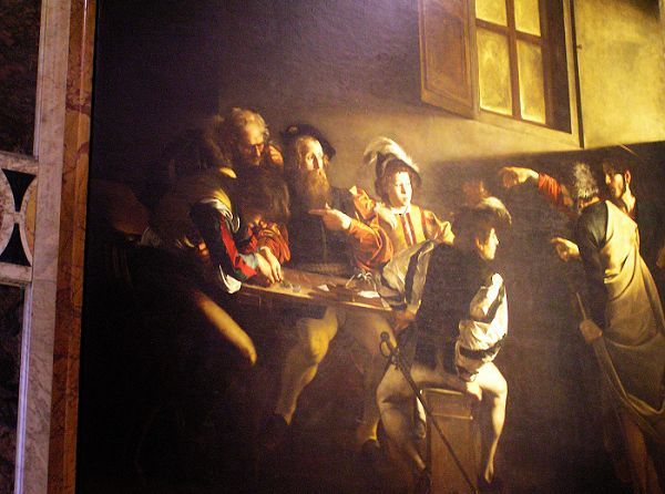 在這個房間內,側扭著雙肩的聖彼得幾乎遮住了耶穌,只露出耶穌的面孔和右手。而桌子旁坐了五位稅警(手指著自己的人是馬太,低頭算錢的是猶大),他們正在玩遊戲。當耶穌和聖彼得出現時,他們十分驚訝,房間的黑暗立刻被一道光劈開!這束光源使人物的輪廓、稜角和動作十分突出,有著很深的戲劇效果。桌子右邊有兩個年輕人互相面對面坐著,透過這種安排突出整幅畫的空間感,使我們進入場景,進入這房間的立體方位中。