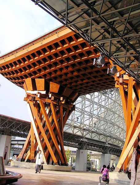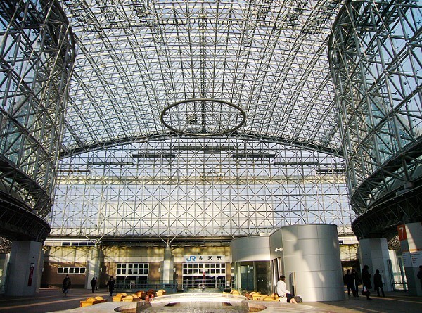 JR金澤車站東口廣場運用鋼骨結構、玻璃帷幕建造成的JR金澤車站,猛一看還以為是巨蛋呢!