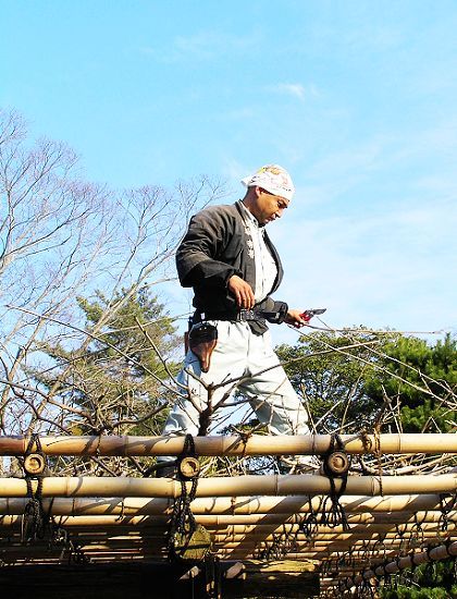 在平等院入口處買完票,一轉進來就看到站在高處修剪花木的園丁