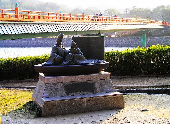 這是源氏物語中,勻宮與浮舟的雕像。後方紅色的橋就是朝霧橋