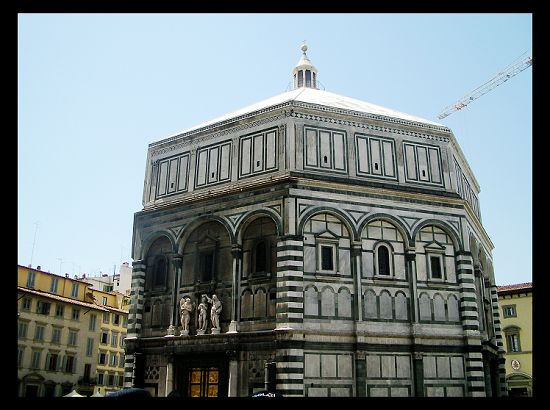 在百花大教堂的旁邊,有一座八角形的建築物,叫做聖喬凡尼洗禮堂,洗禮堂有三面銅門,其中由羅倫佐‧吉柏提費時15年才製作完成的北門在藝術史上佔有重要的地位。